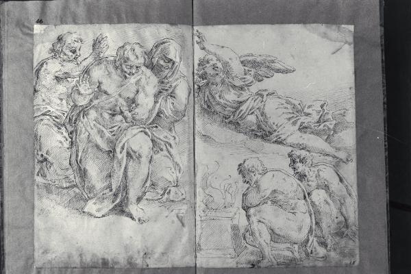 Angelo in volo; due figure inginocchiate presso un'ara. Angelo in volo; due figure inginocchiate presso un'ara