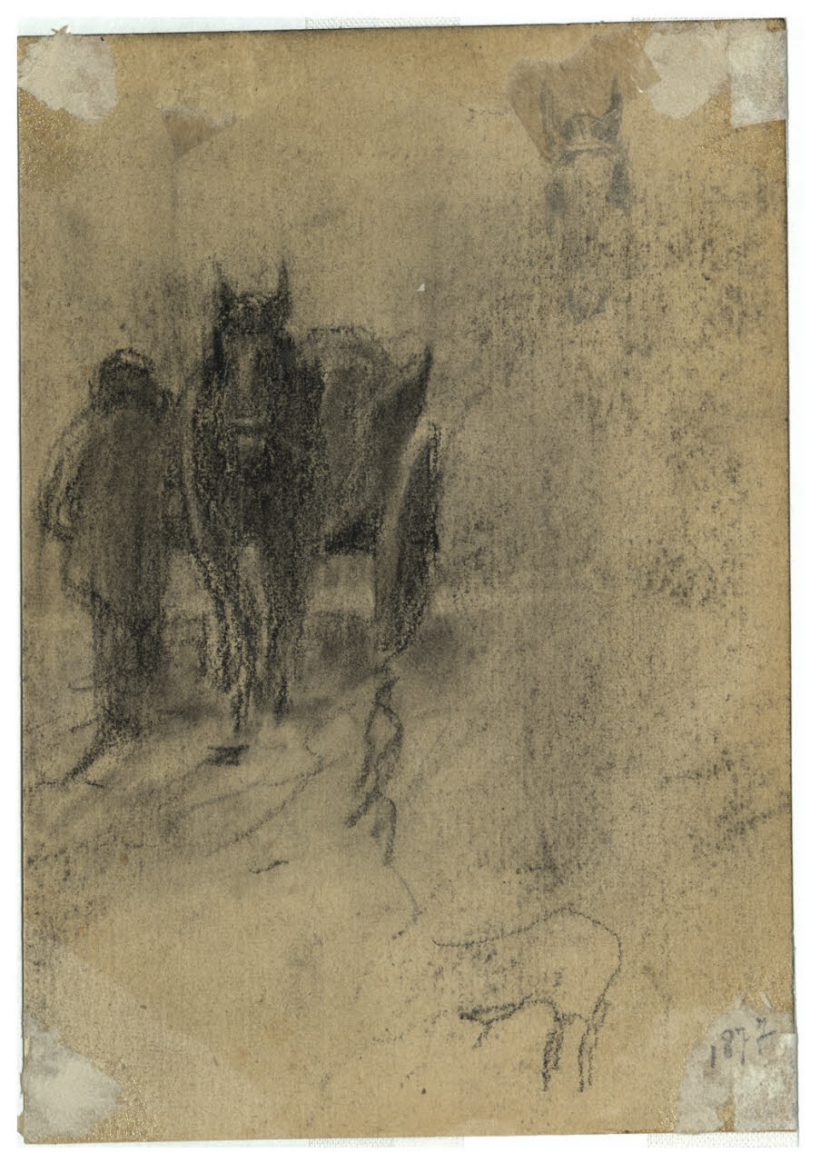 - NOTIZIE STORICO CRITICHE Nel periodo compreso tra la fine dell'estate e l'autunno del 1885, Vittore Grubicy realizzò numerosi studi ambientati nelle campagne fiamminghe, con alcuni schizzi di scorci di paesaggi, animali e altri soggetti di vita contadina, di cui fa parte anche questo disegno in esame.