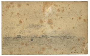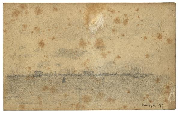 - NOTIZIE STORICO CRITICHE Nell'estate del 1897 si era svolta la seconda Esposizione Internazionale di Venezia, alla quale Vittore Grubicy prese parte con tre dipinti. In quella circostanza, l'artista si era recato nella città lagunare e vi si trattenne per un breve periodo di soggiorno, durante il quale realizzò numerosi disegni, per la maggior parte colti dalla sponda del lido e orientati in direzione della città (Rebora, 1995). Lo sviluppo orizzontale della composizione e i pochi tratteggi per la resa atmosferica del cielo connotano questo disegno, realizzato con una estrema semplificazione dei mezzi espressivi.