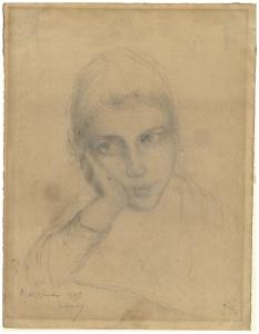 - NOTIZIE STORICO CRITICHE Tra la fine del 1895 e l'inizio dell'anno successivo, Vittore Grubicy realizzò un piccolo nucleo di disegni a matita, incentrati sullo studio di alcune figure femminili, contadine e massaie di Miazzina, dove l'artista trascorreva i mesi invernali. Il foglio in esame si caratterizza per la particolare delicatezza del tratto, memore di certa grafica ranzoniana nella resa sensibile e intimista dello sguardo della giovane modella (Rebora 1995).