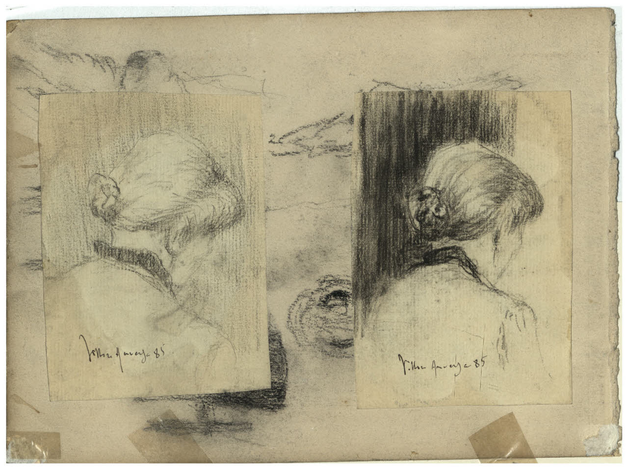 - NOTIZIE STORICO CRITICHE Questi due studi di testa di donna sono incollati su supporto precedentemente disegnato a carboncino. Entrambi sono firmati e datati da Vittore Grubicy e fanno parte di una serie di studi relativi a immagini femmili, in cui si riscontra una certa derivazione da prototipi scapigliati, e in particolare da quelli di Daniele Ranzoni (Rebora 1995). La modella è probabilmente una cameriera di un'osteria di Anversa, immortalata da Grubicy in diverse occasioni (Rebora 1995, nn. 118-124), prediligendo spesso la vista di tergo della nuca e dell'acconciatura raccolta in uno chignon.