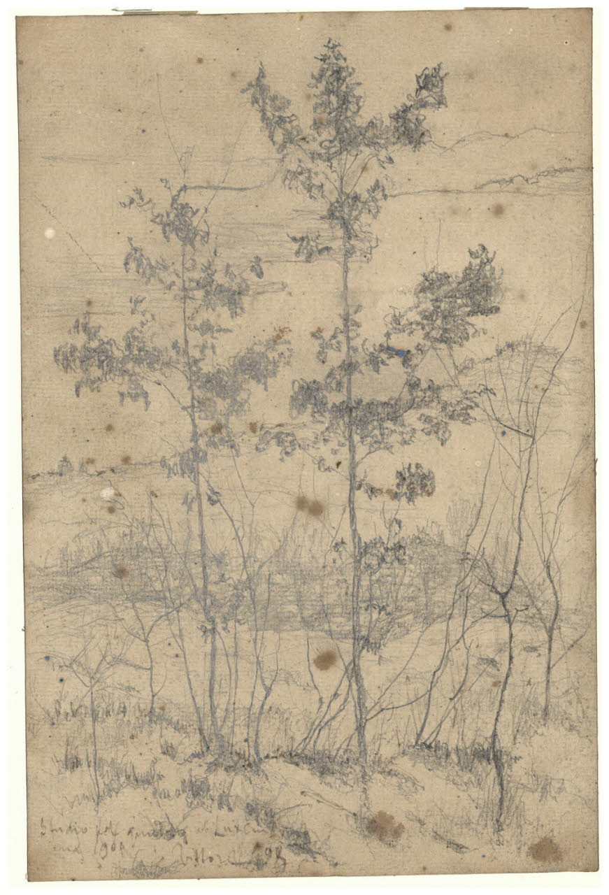 - NOTIZIE STORICO CRITICHE Come annota lo stesso Grubicy, il disegno in esame deve essere messo in rapporto con il dipinto a olio intitolato "Mattino", esposto alla Biennale di Venezia nel 1909 e oggi conservato presso il Musée d'Orsay di Parigi. Il quadro venne acquistato dal Ministero francese della Cultura, insieme a un gruppo di opere di Grubicy destinate al Musée du Luxembourg di Parigi a ulteriore spiegazione dell'iscrizione apposta dallo stesso artista sul disegno. Il foglio differisce dal dipinto nella posizione degli alberi in primo piano (Rebora 1995), ma la scelta del paesaggio e del taglio, il lago Maggiore e le alture di Miazzina, schermata da tronchi brulli, sono elementi cari alla poetica di Grubicy.