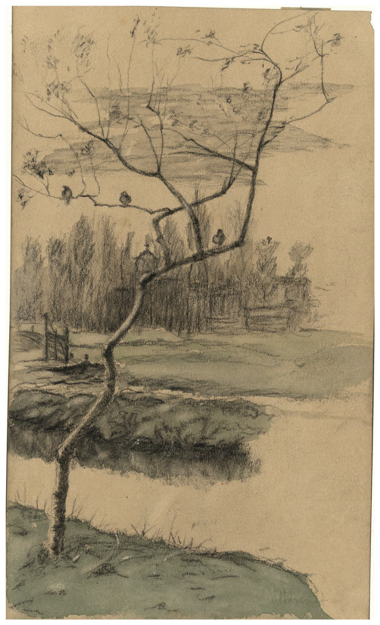- NOTIZIE STORICO CRITICHE Durante la sua permanenza all'Aja nell'autunno del 1884, Vittore Grubicy realizzò alcune vedute osservate nei pressi della vicina Scheweningen, di cui fa parte anche questo paesaggio campestre attraversato da un canale d'acqua, ravvivato da leggere striature acquarellate.