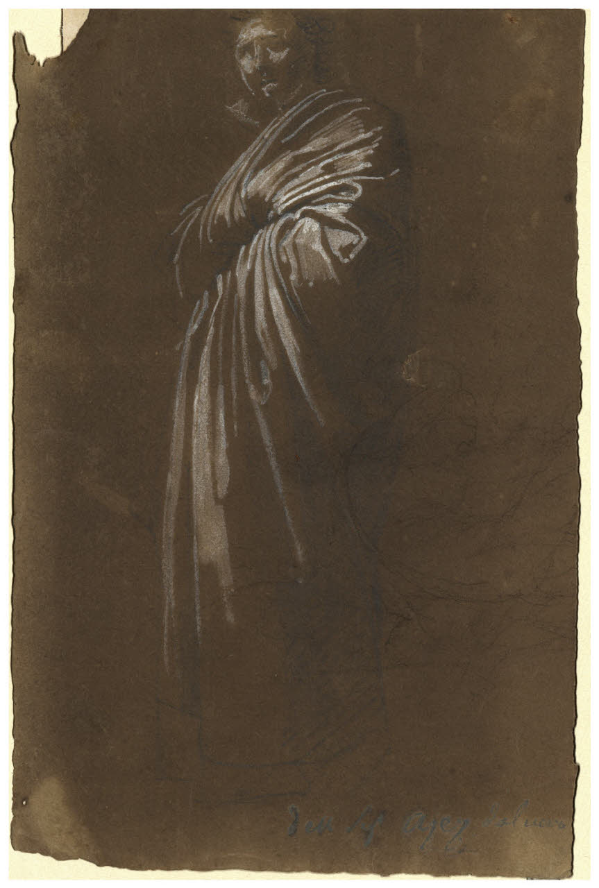 - NOTIZIE STORICO CRITICHE Il foglio mostra uno studio di pieghe per una figura maschile avvolta in una tunica. Il tratteggio è insistito nel panneggio, mentra nella parte inferiore della figura è lasciato al solo stadio di abbozzo. Un'iscrizione a inchiostro in basso a destra del foglio informa che la composizione sarebbe stata realizzata da Francesco Hayez dal vero. Il modello per questo ritratto a figura intera stante potrebbe essere in via dubitativa lo scultore e amico di Hayez, Pompeo Marchesi. L'ipotesi sembra corroborata dal confronto con il ritratto di quest'ultimo conservato presso la Galleria d'Arte Moderna di Milano eseguito dallo stesso Hayez nel 1830 circa, con cui condivide lo sguardo vivace sotto le sopracciglia leggermente corrucciate e la capigliatura disordinata che incornicia il volto.\nIl foglio era indicato come Appiani nella prima guida del Museo Artistico Municipale (1879).