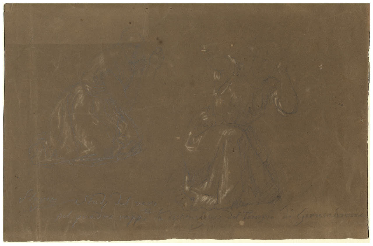 - NOTIZIE STORICO CRITICHE Nel 1867, ormai settantasettenne, Francesco Hayez si cimentò in un grande quadro storico come "La distruzione del Tempio di Gerusalemme" che donò successivamente all'Accademia di Belle Arti di Venezia, sua città natale. Il disegno in esame arricchisce l'abbondante documentazione grafica che illustra il lungo e laborioso processo creativo del dipinto, presentando lo studio di due figure femminili inginocchiate in atteggiamento di terrore e lo studio del particolare della mano di una di esse. Stando all'iscrizione manoscritta riportata sul foglio, le due fgure vennero studiate dal vero e corrispondono, con alcune varianti dell'abbigliamento e delle acconciature dei capelli, nelle due donne, l'una accovaggiata accanto all'altra, nell'angolo a destra della composizione dipinta. In questo foglio Hayez si concentra non soltanto sulle espressioni terrorizzate delle figure, ma anche sul panneggio delle vesti, delicatamente lumeggiate a gessetto bianco.