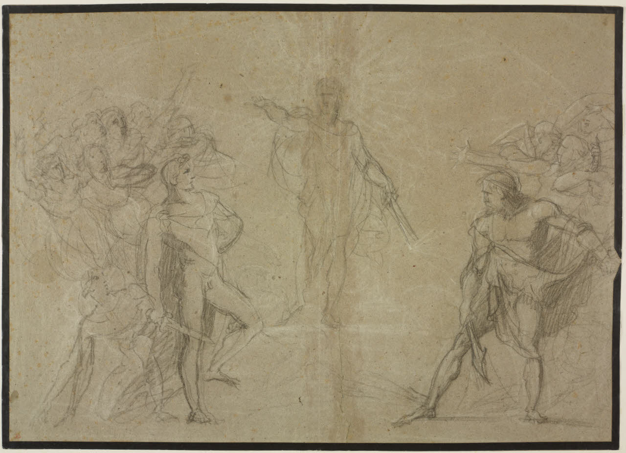 - NOTIZIE STORICO CRITICHE Nel mezzo della composizione svetta una figura maschile, armata, che dirige lo scontro tra due guerrieri che si apprestano a combattere; dietro ciascun duellante si trova un gruppo di figure maschili e femminili. Il foglio appartenne alla collezione di Carlo Prayer prima di passare nella raccolta Henry Prior.