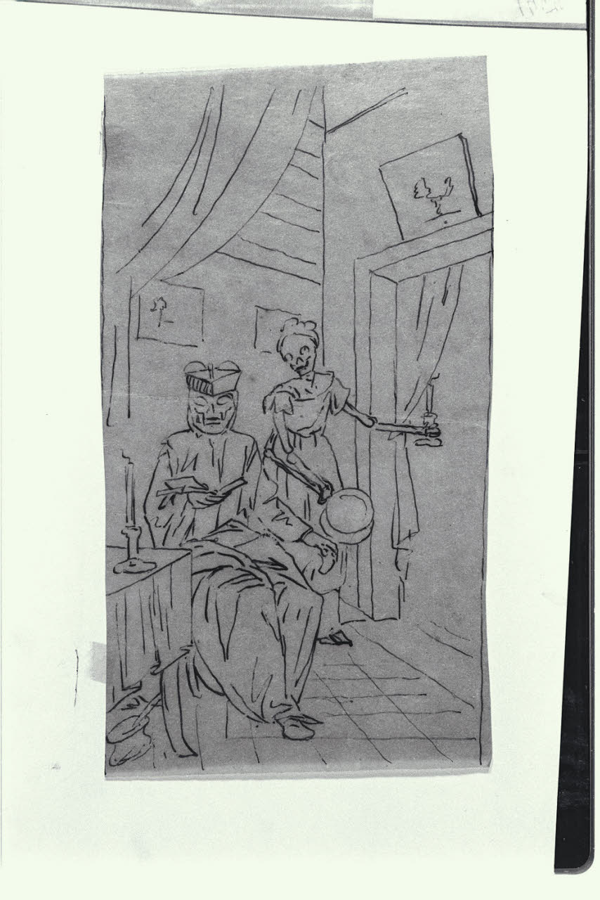 Scheletri di un prete seduto che legge e di una donna con candeliere e vaso da notte
