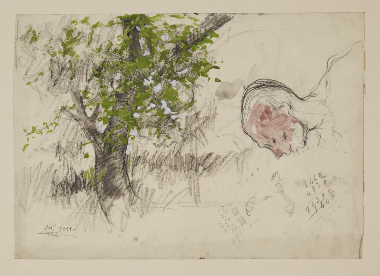 carta/ grafite/ pietra nera/ acquerelli (rosa, grigio)/ tempera (bianca, verde)