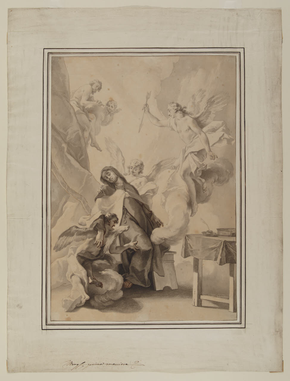 - NOTIZIE STORICO CRITICHE Prima del 1943, il disegno in esame faceva parte della collezione del Principe Alberico XII Barbiano di Belgioioso, dove venne attribuito al pittore, storico e critico d'arte tedesco Anton Raphael Mengs da Giuseppe Bossi, chiamato a stimare i beni dell'illustre collezionista milanese alla sua morte. Precerutti Garberi pubblicò il disegno a più riprese (1969; 1971) come opera di Giovanni Battista Pittoni, mentre studi più recenti di Eugenio Martini (1982; 1989) e di Ugo Ruggeri (1989) ne hanno assegnato convincentemente la paternità a Mattia Bortoloni. Databile stilisticamente al tempo della decorazione della Parrocchiale di Fratta Polesine, eseguita dal Bortoloni tra il 1734 e il 1735 nella sua piena maturità, il foglio si presenta estremamente finito in ogni suo dettaglio ed è eseguito con un'accuratissima tecnica all'acquarello a vari toni di grigio su carta rosata giallina. L'opera raffigura l'estasi di santa Teresa: quest'episodio mistico, vissuto dalla santa fondatrice dei carmelitani scalzi e narrato nella sua autobiografia, viene reso dall'artista con grande efficacia e teatralità, grazie all'adozione di un pesante drappeggio sulla sinistra del foglio ad uso di cortina e all'entrata in scena a cavallo di una nuvola dell'angelo in veste di Eros cristiano che colpirà al petto la santa con il suo dardo. Mentre due angeli in alto a sinistra osservano la scena come semplici spettatori, altri due sostengono la santa che si abbandona all'estasi. Il tavolino con un libro chiuso e il calamaio restano i soli elementi scenografici a richiamo delle meditazioni ascetiche di santa Teresa sul mistero della Passione di Cristo. Questo foglio di Bortoloni risente ancora dell'influenza del suo primo maestro Antonio Balestra, e si può avvicinare ad un altro disegno attribuito allo stesso artista raffigurante l'Annunciazione, in collezione privata (cfr. Martini 1989, p. 41). Non andrà neppure trascurato l'ascendente del conterraneo Sebastiano Ricci che lasciò l'Estasi di Santa Teresa nella chiesa di San Girolamo degli Scalzi di Vicenza attorno al 1724, dal quale deriva il motivo dei due angeli che si affacciano tra ammirati e divertiti dall'alto della scena. Alla ricerca di movimento del Ricci, il Pittoni preferì un'equilibrata disposizione a piramide rovesciata e ha come vertice la figura di Santa Teresa.