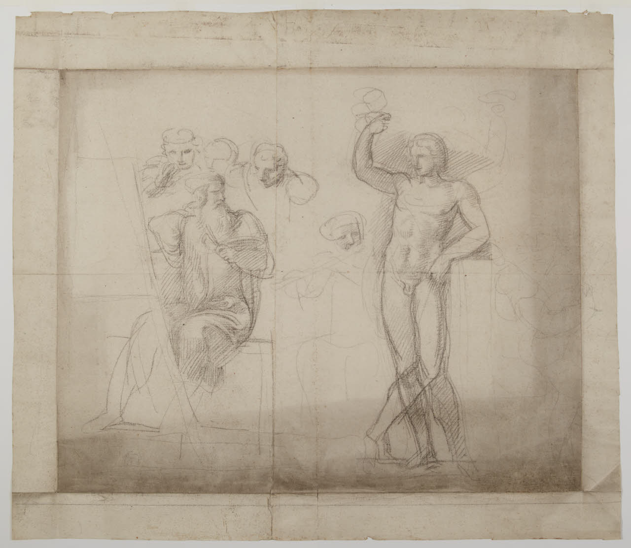 - NOTIZIE STORICO CRITICHE Come rilevato per la prima volta in Maniello 2022, i disegni, tradizionalmente attribuiti a Pelagio Palagi, sono in realtà da riferire a Giuseppe Bossi e alla sua attività nel cantiere di Villa Melzi a Bellagio, su commissione di Francesco Melzi d’Eril. I fogli vanno infatti interpretati come disegni preparatori per due dei quattro sovrapporta a monocromo raffiguranti altrettanti episodi della vita di Francesco Melzi, allievo di Leonardo da Vinci e illustre antenato del committente, realizzati dall’artista tra il 1808 e il 1813 per uno degli ambienti della villa, la cosiddetta sala d’angolo. Nello specifico, il foglio Au. F 12 bis raffigura uno studio per la scena Leonardo insegna la copia dal vero, mentre Au. F 12 ter rappresenta Melzi, accanto al busto di Leonardo, detta le memorie del maestro.\n(Simona Maniello)