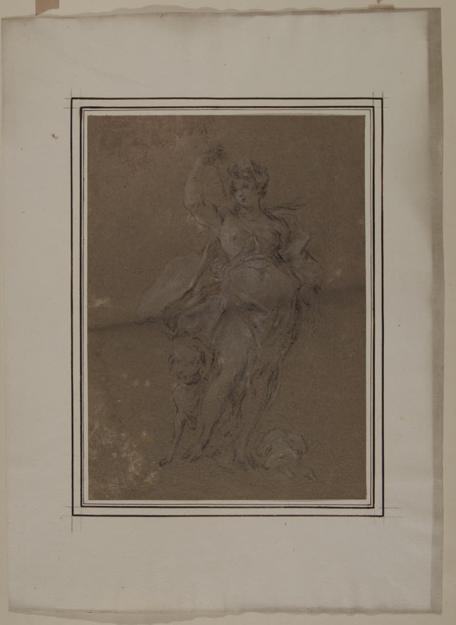 - NOTIZIE STORICO CRITICHE Il foglio in esame, proveniente dalla Raccolta Trivulzio, è stato attribuito da una nota manoscritta di Arslan al pittore veneziano Giovanni Antonio Pellegrini. Il disegno realizzato a carboncino e gessetto bianco su carta cenerognola illustra una figura femminile discinta con un braccio sollevato sopra la testa e due cani da caccia ai suoi piedi. Per la particolare iconografia, la figura sarebbe da identificarsi con la dea della caccia Diana, e si accompagna ai suoi fedeli cani, mentre è intenta a sfilare una freccia dalla faretra che sporge dalle sue spalle.