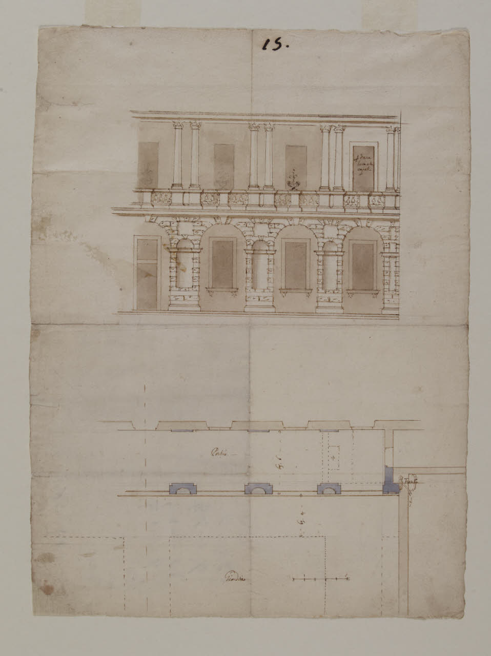 Particolare della pianta e della facciata di un palazzo con portico e loggiato. Particolare della pianta e della facciata di un palazzo con portico e loggiato