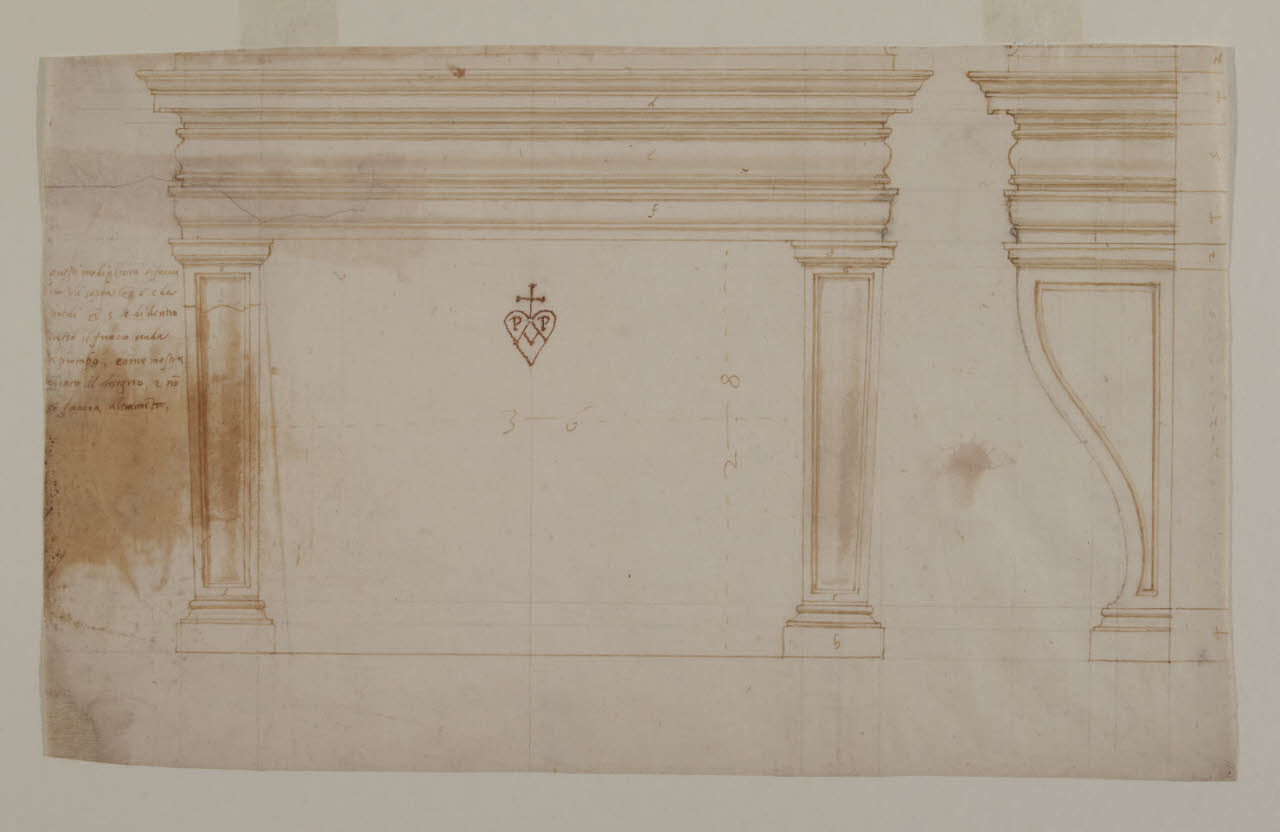 - NOTIZIE STORICO CRITICHE L'Album Tibaldi entra nelle raccolte del Civico Museo d'Arte Antica, al Castello Sforzesco, nel 1905 quando è acquistato grazie al mercante d'arte Julius Böhler di Monaco. Nel 1904 l'avvocato Giuseppe Toesca propone senza successo l'acquisto dell'album al Consiglio Direttivo del Museo. Un anno più tardi, con una grande riduzione di prezzo (da 1800 a 800 lire), la raccolta di 42 disegni entra nelle collezioni civiche su proposta di Gustavo Frizzoni e con il benestare di Luca Beltrami. L'album Tibaldi aveva fatto parte della collezione di Carlo Morbio (1811-1881), nato a Novara ma stabilitosi fin da giovane a Milano. Nel "Catalogo ragionato ed illustrazione degli autografi e dei ritratti di celebri personaggi dal Risorgimento delle lettere insino a noi, raccolti e posseduti dal cav. Carlo Morbio" (Milano, 1857, p. 97) e ancora nelle "Opere Storico-Numismatiche di Carlo Morbio" (Bologna, 1870, p. 186) è lo stesso Morbio a citare la "Cartella di Pellegrino" definita una "preziosa raccolta de' suoi disegni originali" notando come "varj sono firmati col suo monogramma" (1857). È probabile sia stato soprattutto il fraintendimento del monogramma PPAM (inscritto in un cuore sormontato da una croce), all'epoca interpretato come firma di Pellegrino Pellegrini, ad aver portato il conoscitore e chi dopo di lui ebbe modo di vedere e valutare i disegni all'errata attribuzione al Tibaldi; ancora nel 1939, Giovanni Rocco parla in questi termini del marchio dell'album nella sua pubblicazione dedicata all'impegno dell'artista della Valsolda presso il Duomo di Milano. Dopo la morte del Morbio, la figlia Giulia, moglie dell'imprenditore tessile Benigno Crespi, cede gran parte della collezione paterna al libraio Theodor Ackermann che la vende in varie aste a Lipsia. Un altro mercante tedesco, il già citato Böhler, fa da mediatore per il ritorno dei disegni a Milano. \nTornando al monogramma, qui assente, il suo significato è intuito da Thurber (1994): Pompeo Pedemonte Architetto Mantovano. Il foglio 25 dell'album Tibaldi mostra la parte inferiore di un camino nel quale montanti lievemente rastremati reggono un'articolata cornice. Già Thurber nota come questo foglio e quello che lo segue nell'album, entrambi progetti per camini non identificati, condividano una simile impaginazione: prospetto frontale e profilo laterale mostrato ortogonalmente. Tale formula ricorre anche in un foglio (Parigi, Louvre, 3578) attribuito a Giulio Romano da Howard Burns. Thurber nota come le scritte presenti sul foglio di Parigi, attribuite da Burns a un non identificato collaboratore, siano di mano di Pedemonte. Per questa ragione e per "il tratto un poco incerto, il dinamismo rattenuto della linea" Carpeggiani (2002, p. 74) riconosce il disegno a Pompeo Pedemonte pur lasciando spazio al dubbio e facendo presente come non sia inusuale il trovare su disegni di un certo autore note d'altra mano. Il parere di Carpeggiani è accolto da Giulio Zavatta (2011) che mette in relazione i tre progetti per camino già citati, con l'aggiunta di un quarto progetto attribuito da Zavatta all'architetto mantovano e conservato al Metropolitan Museum di New York (inv. 61.658.38), con i lavori eseguiti per Alfonso I Gonzaga a Novellara negli anni Sessanta del Cinquecento. Si noti infine che la filigrana è la stessa dei fogli 1, 7 e 11 di questo album, tutti dell'architetto mantovano.