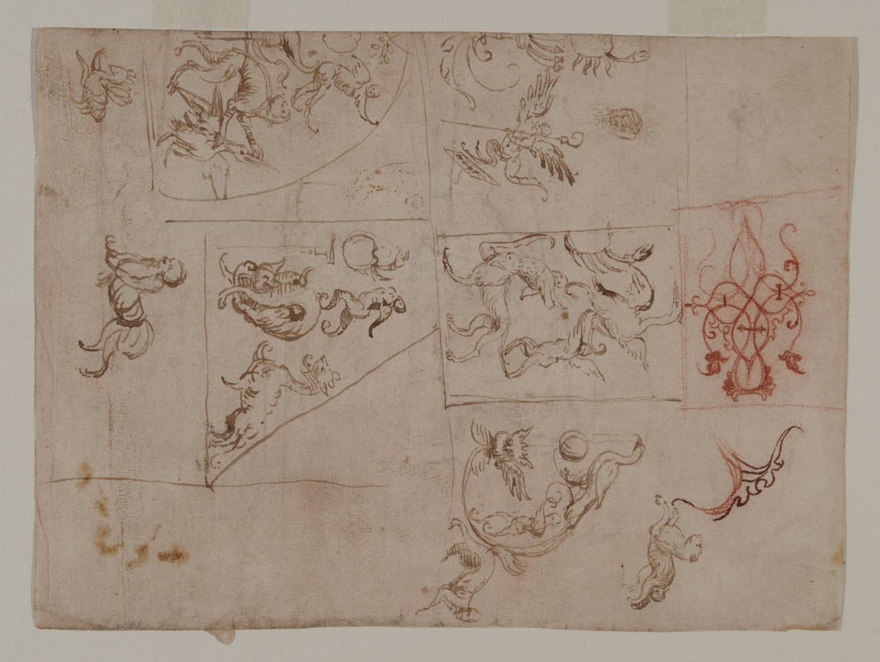 - NOTIZIE STORICO CRITICHE L'Album Tibaldi entra nelle raccolte del Civico Museo d'Arte Antica, al Castello Sforzesco, nel 1905 quando è acquistato grazie al mercante d'arte Julius Böhler di Monaco. Nel 1904 l'avvocato Giuseppe Toesca propone senza successo l'acquisto dell'album al Consiglio Direttivo del Museo. Un anno più tardi, con una grande riduzione di prezzo (da 1800 a 800 lire), la raccolta di 42 disegni entra nelle collezioni civiche su proposta di Gustavo Frizzoni e con il benestare di Luca Beltrami. L'album Tibaldi aveva fatto parte della collezione di Carlo Morbio (1811-1881), nato a Novara ma stabilitosi fin da giovane a Milano. Nel "Catalogo ragionato ed illustrazione degli autografi e dei ritratti di celebri personaggi dal Risorgimento delle lettere insino a noi, raccolti e posseduti dal cav. Carlo Morbio" (Milano, 1857, p. 97) e ancora nelle "Opere Storico-Numismatiche di Carlo Morbio" (Bologna, 1870, p. 186) è lo stesso Morbio a citare la "Cartella di Pellegrino" definita una "preziosa raccolta de' suoi disegni originali" notando come "varj sono firmati col suo monogramma" (1857). È probabile sia stato soprattutto il fraintendimento del monogramma PPAM (inscritto in un cuore sormontato da una croce), all'epoca interpretato come firma di Pellegrino Pellegrini, ad aver portato il conoscitore e chi dopo di lui ebbe modo di vedere e valutare i disegni all'errata attribuzione al Tibaldi; ancora nel 1939, Giovanni Rocco parla in questi termini del marchio dell'album nella sua pubblicazione dedicata all'impegno dell'artista della Valsolda presso il Duomo di Milano. Dopo la morte del Morbio, la figlia Giulia, moglie dell'imprenditore tessile Benigno Crespi, cede gran parte della collezione paterna al libraio Theodor Ackermann che la vende in varie aste a Lipsia. Un altro mercante tedesco, il già citato Böhler, fa da mediatore per il ritorno dei disegni a Milano. \nI fogli 33 e 34 presentano studi per grottesche, appunti a penna per una sorta di piccolo repertorio di diversi elementi che possono comporre la decorazione di muri o soffitti: maschere, putti, uccelli e bestie fantastiche tipiche di questo genere. Al verso di questo foglio (33) una lunga scritta quasi completamente illeggibile e una decina di studi a penna per una scimmia.