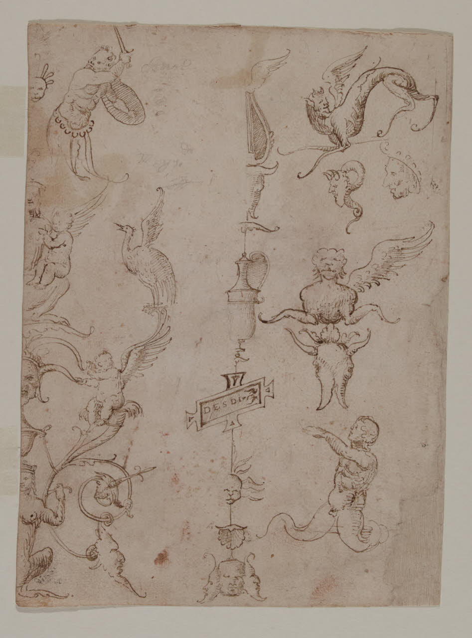 - NOTIZIE STORICO CRITICHE L'Album Tibaldi entra nelle raccolte del Civico Museo d'Arte Antica, al Castello Sforzesco, nel 1905 quando è acquistato grazie al mercante d'arte Julius Böhler di Monaco. Nel 1904 l'avvocato Giuseppe Toesca propone senza successo l'acquisto dell'album al Consiglio Direttivo del Museo. Un anno più tardi, con una grande riduzione di prezzo (da 1800 a 800 lire), la raccolta di 42 disegni entra nelle collezioni civiche su proposta di Gustavo Frizzoni e con il benestare di Luca Beltrami. L'album Tibaldi aveva fatto parte della collezione di Carlo Morbio (1811-1881), nato a Novara ma stabilitosi fin da giovane a Milano. Nel "Catalogo ragionato ed illustrazione degli autografi e dei ritratti di celebri personaggi dal Risorgimento delle lettere insino a noi, raccolti e posseduti dal cav. Carlo Morbio" (Milano, 1857, p. 97) e ancora nelle "Opere Storico-Numismatiche di Carlo Morbio" (Bologna, 1870, p. 186) è lo stesso Morbio a citare la "Cartella di Pellegrino" definita una "preziosa raccolta de' suoi disegni originali" notando come "varj sono firmati col suo monogramma" (1857). È probabile sia stato soprattutto il fraintendimento del monogramma PPAM (inscritto in un cuore sormontato da una croce), all'epoca interpretato come firma di Pellegrino Pellegrini, ad aver portato il conoscitore e chi dopo di lui ebbe modo di vedere e valutare i disegni all'errata attribuzione al Tibaldi; ancora nel 1939, Giovanni Rocco parla in questi termini del marchio dell'album nella sua pubblicazione dedicata all'impegno dell'artista della Valsolda presso il Duomo di Milano. Dopo la morte del Morbio, la figlia Giulia, moglie dell'imprenditore tessile Benigno Crespi, cede gran parte della collezione paterna al libraio Theodor Ackermann che la vende in varie aste a Lipsia. Un altro mercante tedesco, il già citato Böhler, fa da mediatore per il ritorno dei disegni a Milano. \nI fogli 33 e 34 presentano studi per grottesche, appunti a penna per una sorta di piccolo repertorio di diversi elementi che possono comporre la decorazione di muri o soffitti: maschere, putti, uccelli e bestie fantastiche tipiche di questo genere. Al verso di questo foglio (34) tre studi, probabilmente dal vero, in penna e polvere rossa di un uomo sdraiato a terra in diverse posizioni: prono e supino con le gambe distese e supino con le gambe accavallate.