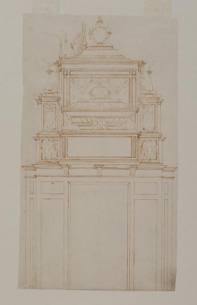 • NOTIZIE STORICO CRITICHE L'Album Tibaldi entra nelle raccolte del Civico Museo d'Arte Antica, al Castello Sforzesco, nel 1905 quando è acquistato grazie al mercante d'arte Julius Böhler di Monaco. Nel 1904 l'avvocato Giuseppe Toesca propone senza successo l'acquisto dell'album al Consiglio Direttivo del Museo. Un anno più tardi, con una grande riduzione di prezzo (da 1800 a 800 lire), la raccolta di 42 disegni entra nelle collezioni civiche su proposta di Gustavo Frizzoni e con il benestare di Luca Beltrami. L'album Tibaldi aveva fatto parte della collezione di Carlo Morbio (1811-1881), nato a Novara ma stabilitosi fin da giovane a Milano. Nel "Catalogo ragionato ed illustrazione degli autografi e dei ritratti di celebri personaggi dal Risorgimento delle lettere insino a noi, raccolti e posseduti dal cav. Carlo Morbio" (Milano, 1857, p. 97) e ancora nelle "Opere Storico-Numismatiche di Carlo Morbio" (Bologna, 1870, p. 186) è lo stesso Morbio a citare la "Cartella di Pellegrino" definita una "preziosa raccolta de' suoi disegni originali" notando come "varj sono firmati col suo monogramma" (1857). È probabile sia stato soprattutto il fraintendimento del monogramma PPAM (inscritto in un cuore sormontato da una croce), all'epoca interpretato come firma di Pellegrino Pellegrini, ad aver portato il conoscitore e chi dopo di lui ebbe modo di vedere e valutare i disegni all'errata attribuzione al Tibaldi; ancora nel 1939, Giovanni Rocco parla in questi termini del marchio dell'album nella sua pubblicazione dedicata all'impegno dell'artista della Valsolda presso il Duomo di Milano. Dopo la morte del Morbio, la figlia Giulia, moglie dell'imprenditore tessile Benigno Crespi, cede gran parte della collezione paterna al libraio Theodor Ackermann che la vende in varie aste a Lipsia. Un altro mercante tedesco, il già citato Böhler, fa da mediatore per il ritorno dei disegni a Milano. \nIl foglio 39 dell'album Tibaldi è un progetto per un monumento funebre posto sopra una porta. Estremamente rifinito e privo di ripensamenti, è ragionevole immaginare si tratti di un disegno da mostrare alla committenza; la presenza della porta che ha tutta l'aria di essere qualcosa di esistente quando il monumento è progettato, è un'ulteriore conferma di tale ipotesi. Repishti (2020) ha pubblicato per primo questo foglio proponendo di attribuirlo ad Agostino Busti sulla base del confronto con i pochi altri disegni noti di mano del Bambaia, in particolare con il foglio 5618 del Cabinet des Dessins du Louvre e con un progetto di camino conservato alla Biblioteca Ambrosiana di Milano (cod. F 252 inf., f. 637).