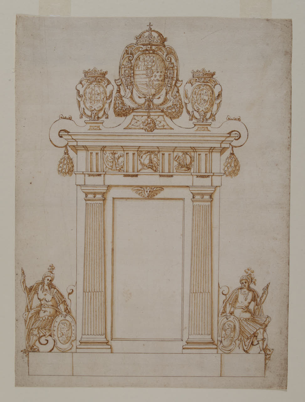 - NOTIZIE STORICO CRITICHE L'Album Tibaldi entra nelle raccolte del Civico Museo d'Arte Antica, al Castello Sforzesco, nel 1905 quando è acquistato grazie al mercante d'arte Julius Böhler di Monaco. Nel 1904 l'avvocato Giuseppe Toesca propone senza successo l'acquisto dell'album al Consiglio Direttivo del Museo. Un anno più tardi, con una grande riduzione di prezzo (da 1800 a 800 lire), la raccolta di 42 disegni entra nelle collezioni civiche su proposta di Gustavo Frizzoni e con il benestare di Luca Beltrami. L'album Tibaldi aveva fatto parte della collezione di Carlo Morbio (1811-1881), nato a Novara ma stabilitosi fin da giovane a Milano. Nel "Catalogo ragionato ed illustrazione degli autografi e dei ritratti di celebri personaggi dal Risorgimento delle lettere insino a noi, raccolti e posseduti dal cav. Carlo Morbio" (Milano, 1857, p. 97) e ancora nelle "Opere Storico-Numismatiche di Carlo Morbio" (Bologna, 1870, p. 186) è lo stesso Morbio a citare la "Cartella di Pellegrino" definita una "preziosa raccolta de' suoi disegni originali" notando come "varj sono firmati col suo monogramma" (1857). È probabile sia stato soprattutto il fraintendimento del monogramma PPAM (inscritto in un cuore sormontato da una croce), all'epoca interpretato come firma di Pellegrino Pellegrini, ad aver portato il conoscitore e chi dopo di lui ebbe modo di vedere e valutare i disegni all'errata attribuzione al Tibaldi; ancora nel 1939, Giovanni Rocco parla in questi termini del marchio dell'album nella sua pubblicazione dedicata all'impegno dell'artista della Valsolda presso il Duomo di Milano. Dopo la morte del Morbio, la figlia Giulia, moglie dell'imprenditore tessile Benigno Crespi, cede gran parte della collezione paterna al libraio Theodor Ackermann che la vende in varie aste a Lipsia. Un altro mercante tedesco, il già citato Böhler, fa da mediatore per il ritorno dei disegni a Milano. \nIl foglio 44 presenta il progetto per un portale, forse apparato effimero, culminante con tre scudi araldici; quello centrale, il più grande, è lo stemma ufficiale di Filippo II d'Asburgo re di Spagna e poi del figlio. Filippo III sposò Margherita d'Austria-Stiria nel 1598 a Ferrara passando poi anche da Milano dove la coppia fu ampiamente celebrata anche perché era intanto morto Filippo II e dunque i coniugi erano ormai regnanti di Spagna.