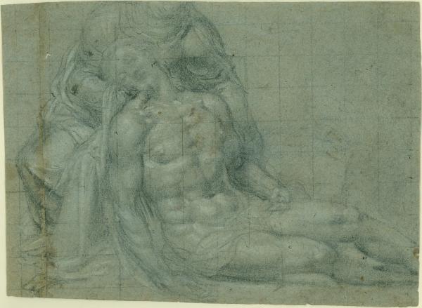disegno su carta grigio-azzurra eseguito a pietra nera con lumeggiature a gessetto bianco, quadrettatura a pietra nera