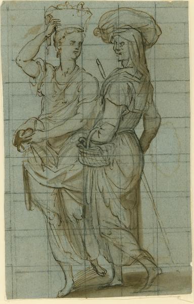 - NOTIZIE STORICO CRITICHE Si tratta di un primo pensiero per le due contadine incluse nella porzione destra dell'Adorazione dei postori, nella zona presbiteriale della Certosa di Garegnano. Giulio Bora (2012) ha messo in luce la discrepanza tra il disegno preparatorio e l'affresco: in quest'ultimo la giovane "non presenterà più le braccia scoperte, forse in osservanza alle rigorose disposizioni contrattuali relative al decoro", così evidenti nel contratto di allogazione.