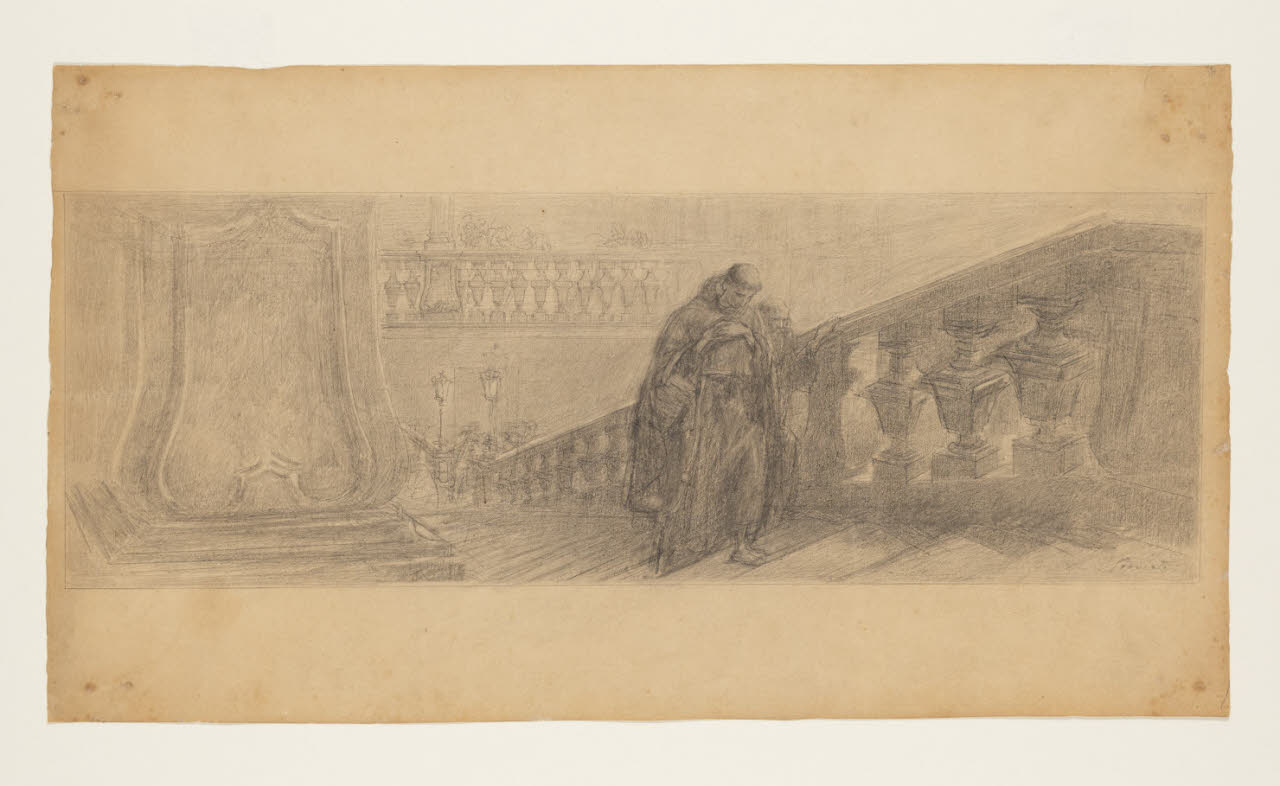 Padre Cristoforo sale lo scalone del palazzo di *** - "Così, con gli occhi bassi, col padre compagno al fianco (...); giunse alla presenza del padron di casa". Illustrazione per i Promessi Sposi - Capitolo IV, intestazione