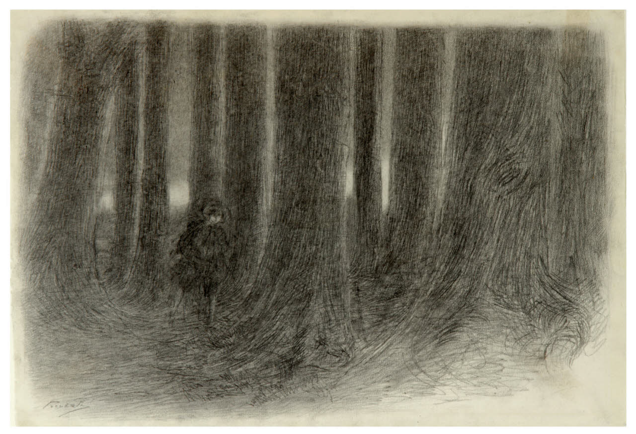 Renzo si addentra nella boscaglia - "Gli alberi che vedeva in lontananza, gli rappresentavan figure strane, deformi, mostruose". Illustrazione per i Promessi Sposi - Capitolo XVII
