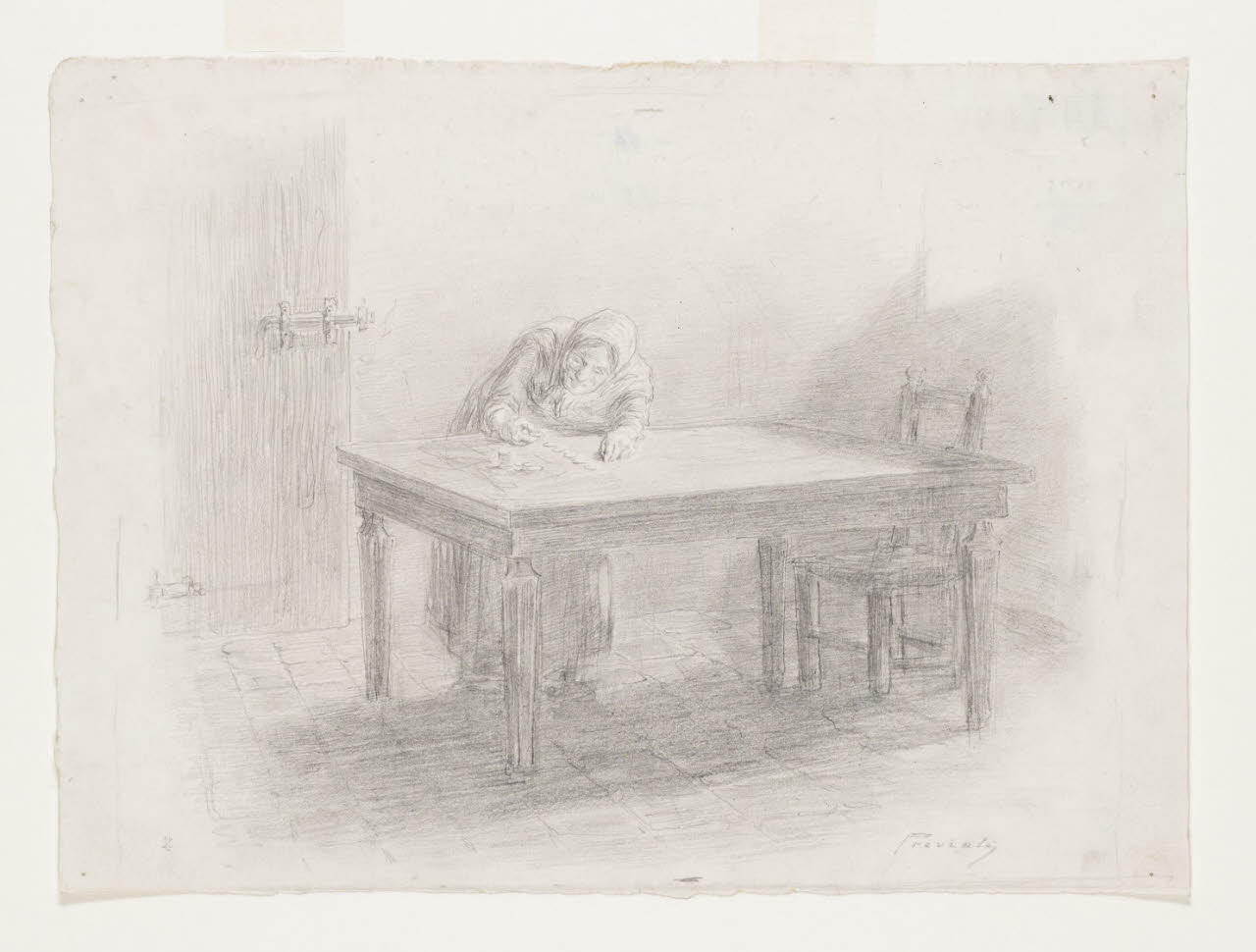Agnese conta i denari sul tavolo - "(...) Si chiuse in camera, svoltò il rotolo, e quantunque preparata, vide con ammirazione". Illustrazione per i Promessi Sposi - Capitolo XXVI