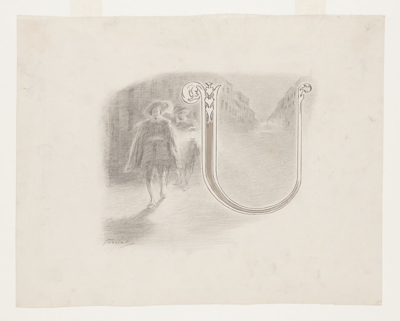 Lettera U - "Una notte (...), proprio nel colmo della peste, tornava don Rodrigo a casa sua". Illustrazione per i Promessi Sposi - Capitolo XXXIII, iniziale