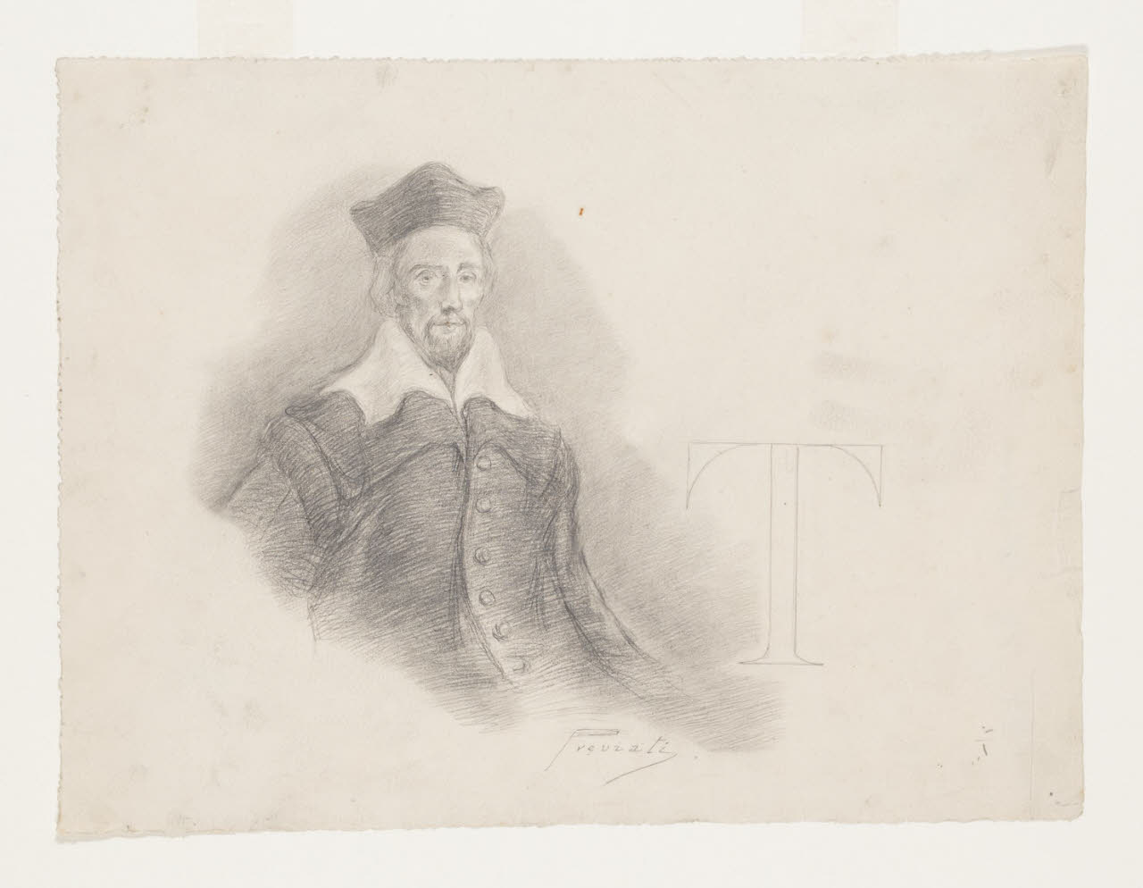 Lettera T - "Tra i molti scrittori contemporanei all’avvenimento, scegliamo il solo che non sia oscuro (...) Giuseppe Ripamonti". Illustrazione per la Storia della colonna infame - Capitolo VII, iniziale