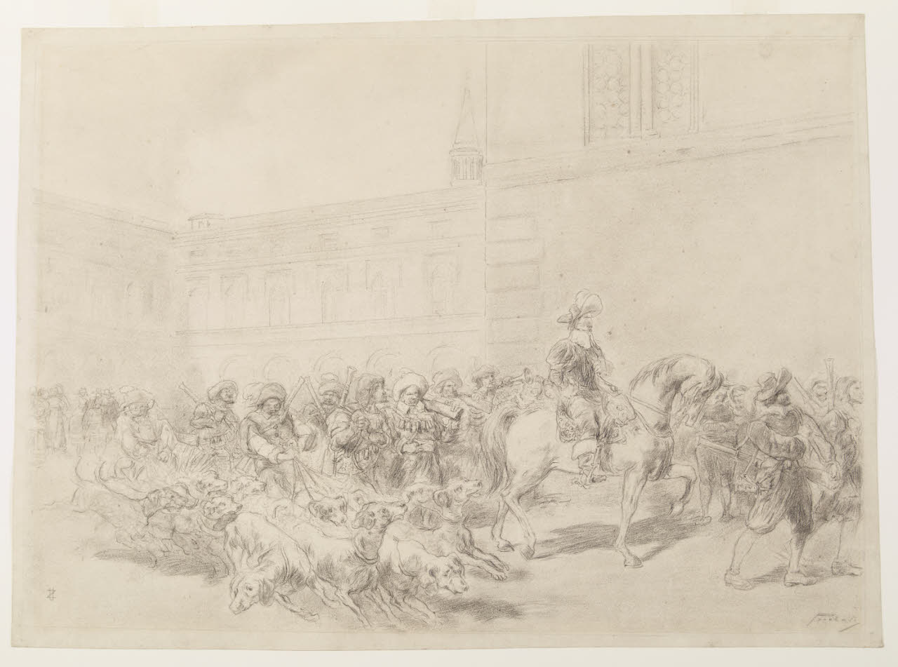 L'innominato esce da Milano - "Attraversò la città a cavallo, con un seguito (...)". Illustrazione per i Promessi Sposi - Capitolo XIX
