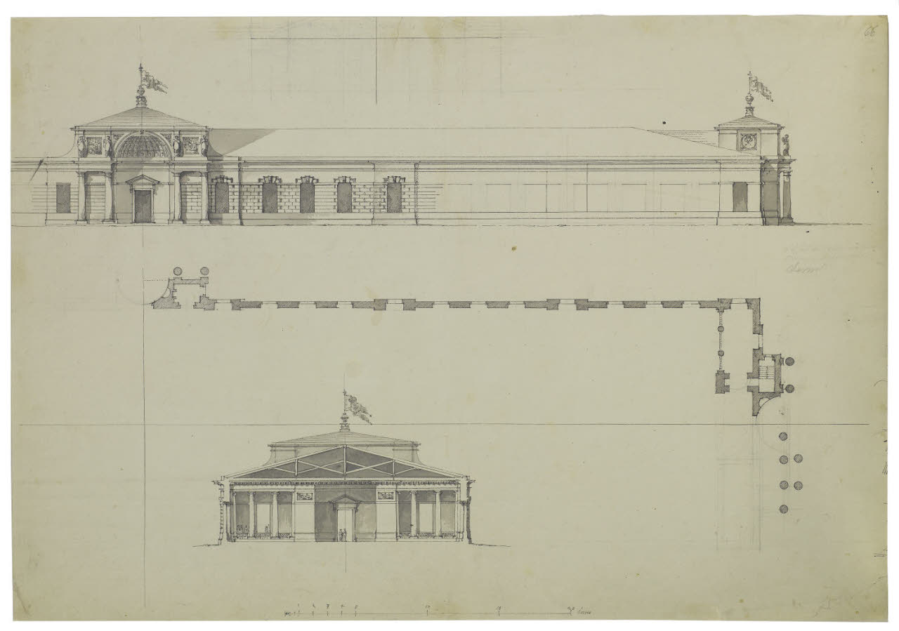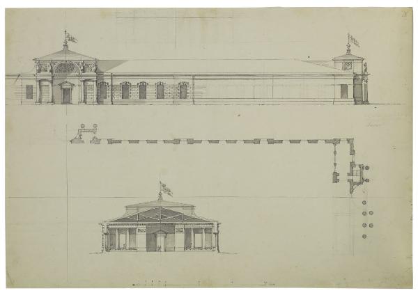 Palestra per esercitazioni militari. Fianco e pianta (parziali). Sezione trasversale. Palestra per esercitazioni militari. Fianco e pianta (parziali). Sezione trasversale