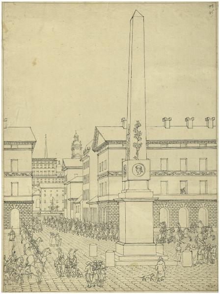 Piazza con obelisco e parata militare. Piazza con obelisco e parata militare