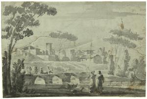 Paesaggio di campagna con ponte, piccolo borgo e due figure. Paesaggio di campagna con ponte, piccolo borgo e due figure