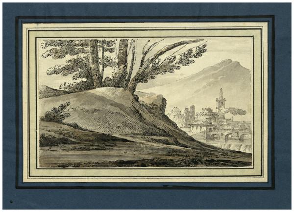 Paesaggio di fantasia con un rialzo del terreno ed alberi in primo piano. Paesaggio di fantasia con un rialzo del terreno ed alberi in primo piano