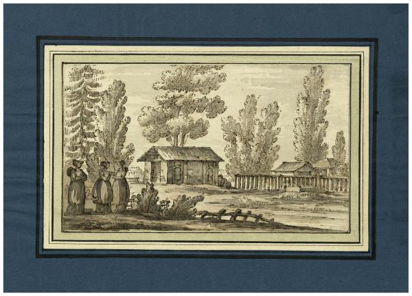 Paesaggio russo con edifici rustici e tre figure in primo piano. Paesaggio russo con edifici rustici e tre figure in primo piano