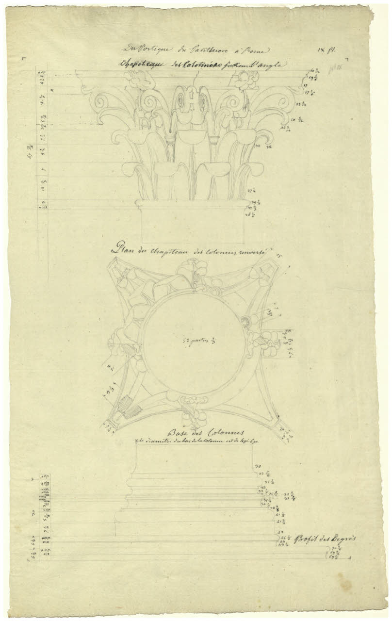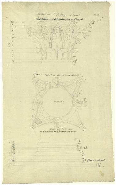 Rilievo del Pantheon ( da Les Antiques Edifices de Rome). Colonna angolare del "portico"; base, pianta e prospetto del capitello. Rilievo del Pantheon ( da Les Antiques Edifices de Rome). Colonna angolare del "portico"; base, pianta e prospetto del capitello