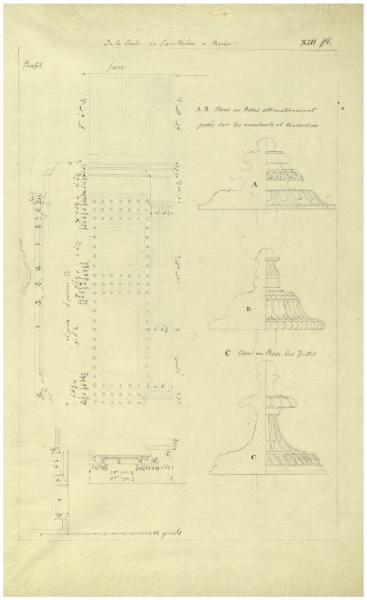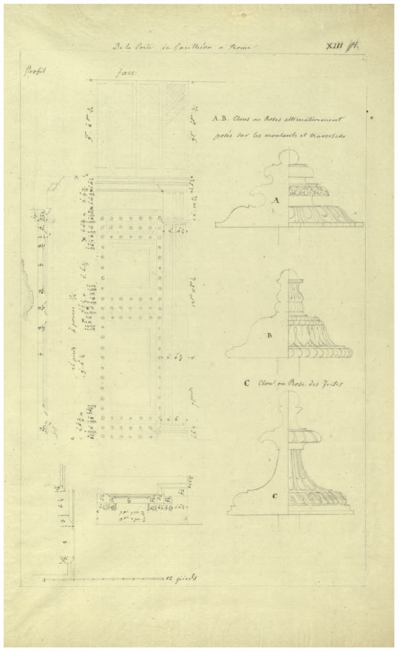 Rilievo del Pantheon (da Les Antiques Edifices de Rome). Portale: prospetto, sezione e pianta. Chiodi: prospetto e sezione. Rilievo del Pantheon (da Les Antiques Edifices de Rome). Portale: prospetto, sezione e pianta. Chiodi: prospetto e sezione