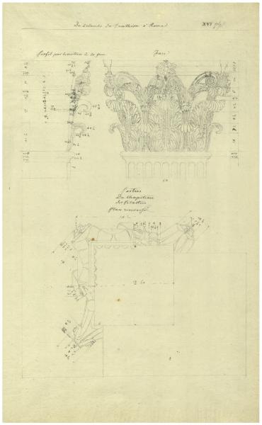 Rilievo del Pantheon (da Les Antiques Edifices de Rome).Capitello dei pilastri interni: prospetto, profilo e pianta. Rilievo del Pantheon (da Les Antiques Edifices de Rome).Capitello dei pilastri interni: prospetto, profilo e pianta