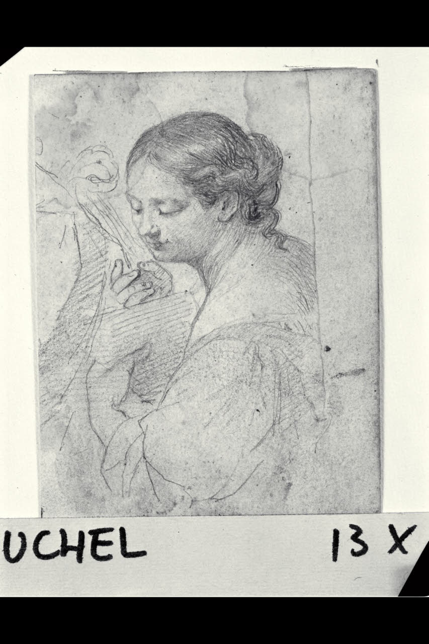 Ritratto di donna a mezzo busto in costume cinquecentesco che suona la cetra