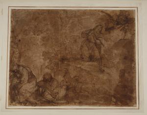 - NOTIZIE STORICO CRITICHE Il disegno in esame fa parte di una serie di tre fogli (Au. D. 445/1 e Au. D 445/2) che condividono non solo il ductus grafico, ma anche il medesimo montaggio, realizzato presumibilmente da un anonimo collezionista prima del loro ingresso nelle collezioni del Principe Alberico XII Barbiano di Belgioioso nel '700. Una nota manoscritta di Giuseppe Bossi su uno dei disegni ne indica la paternità di Tintoretto e a questo artista vennero ascritti al momento del loro ingresso nel museo nel 1943 per dono della famiglia Trivulzio. Verosimilmente i tre disegni in questione possono identificarsi con quelli citati nell'inventario post mortem del Belgioioso "3 disegni di Jacopo Robusti d(etto) il Tintoretto/ Un Cristo all'orto/ Una strage degli Innocenti/ Un martirio di un Santo" (ora trascritto in M. Forni, "Abitare da Principe. Le residenze e le collezioni di Alberico XII Barbiano di Belgiojoso", 2020).