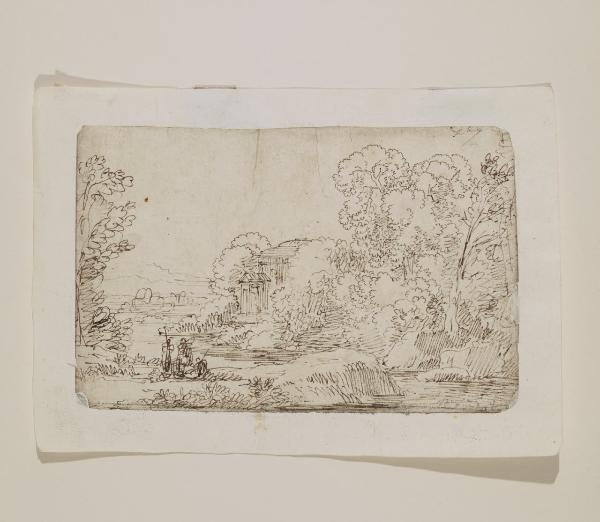 Paesaggio con un tempio un corso d'acqua e macchiette sulla riva a sinistra