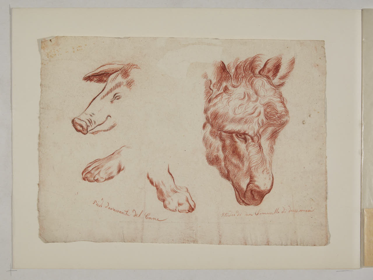 Studi di una testa di suino, delle zampe anteriori di un cane, e della testa di un somarello di due mesi