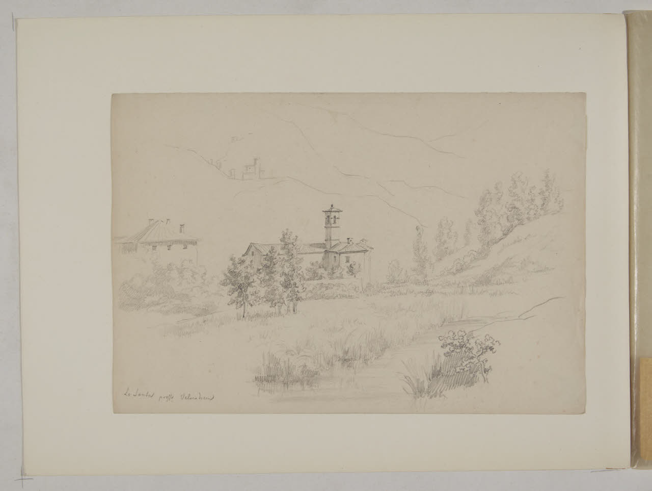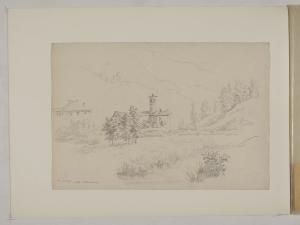 Paesaggio di montagna con corso d'acqua, chiesa e casupole