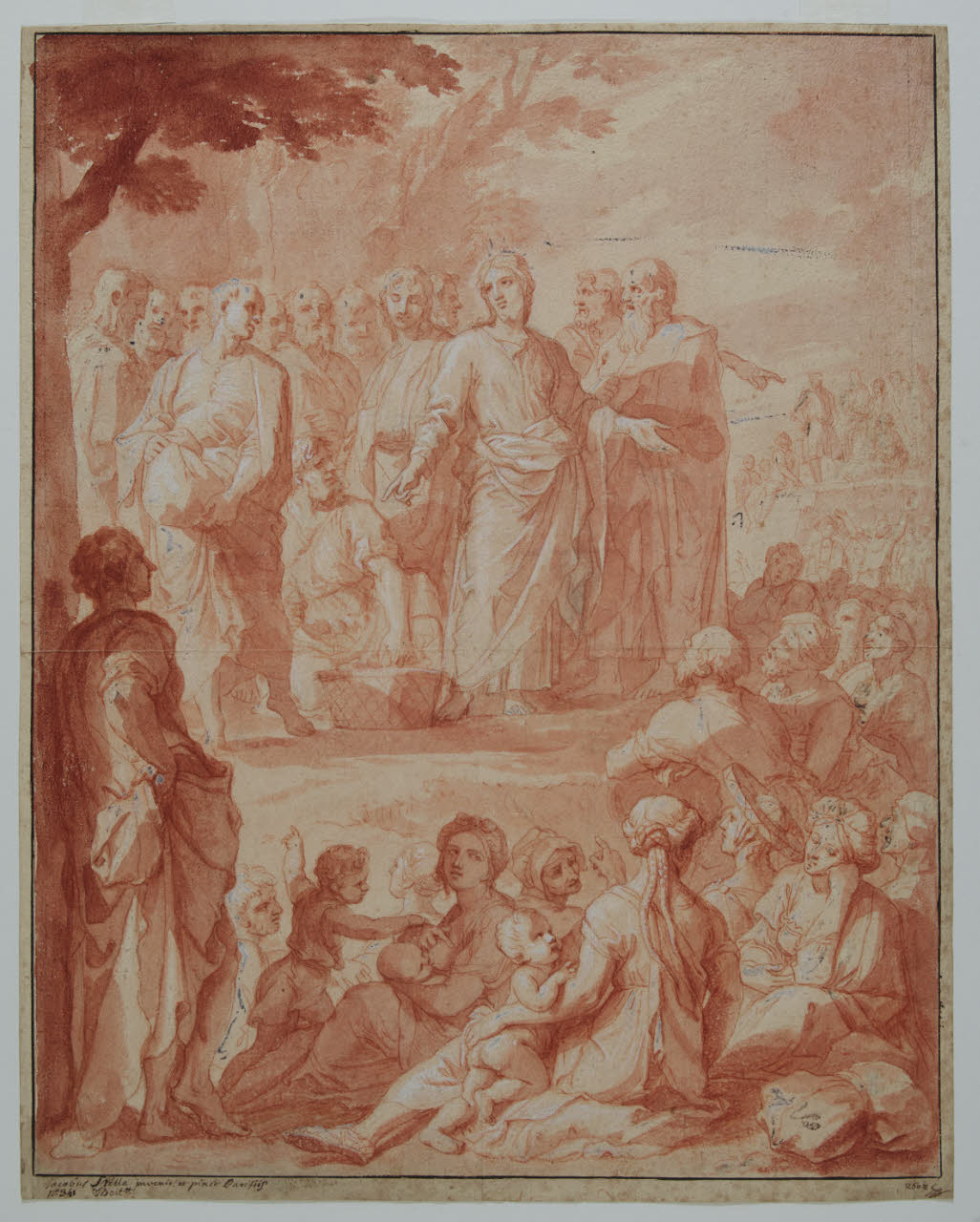 - NOTIZIE STORICO CRITICHE Proveniente dalla collezione di Alberico XII Balbiano di Belgioioso d'Este, questo disegno del pittore e collezionista lionese Jacques Stella entrò nelle collezioni comunali nel 1943 tramite dono della famiglia Trivulzio. Il foglio, firmato e datato 1652 sul verso, illustra il Miracolo della moltiplicazione dei pani ed è da mettere in relazione con il dipinto di analogo soggetto realizzato da Jacques Stella, insieme a quello con la Samaritana al pozzo, per la chiesa del convento dei carmelitani del Faubourg Saint-Jacques, a Parigi. Fondato ai primi del XVII secolo, il complesso conventuale di cui faceva parte la chiesa, venne distrutto nel 1792 e, contrariamente alle opere di altri artisti che vi lavorarono e della Samaritana al pozzo, del Miracolo della moltiplicazione dei pani non si hanno più notizie. Dopo essere stato sequestrato alla Rivoluzione nel 1793, il dipinto subì diverse vicissitudini e l'ultima menzione registrata risale al 12 novembre 1798, quando venne inviato per essere messo in vendita (cfr. Laveissière (ed.), 2006-2007, p. 196, n. 117). Uno schizzo su tela di questo monumentale dipinto venne conservato assai singolarmente da Jacques Stella, poi dai suoi eredi, come si può leggere al numero 35 del testamento della nipote dell'artista Claudine Bouzonnet-Stella (cfr. Szanto, in Laveissière (ed.), 2006-2007, pp. 246-257; in particolare si veda p. 247, n. [46] 35). In un momento imprecisato, il foglio in esame venne acquisito dall’erudito e collezionista parigino Antoine-Joseph Dezallier d’Argenville (1680-1765) che scrisse il proprio numero di inventario, «2607» e sigla nell’angolo in basso a destra. Stella articolò la composizione assai affollata e a sviluppo verticale, in due piani, funzionali anche per suddividere gruppi di figure. L'artista impresse poi profondità alla scena non solo attraverso l’uso sapiente delle modulazioni della sanguigna acquarellata con lumeggiature di biacca, ma anche grazie alla figura di uomo in piedi sulla sinistra appoggiata al tronco di un albero, impiegata con la funzione di repoussoir per introdurre scenicamente l’episodio sacro che, per la natura stessa del miracolo, doveva comportare un gran numero di personaggi. Lo stile misurato e rifinito del foglio, unitamente ai gesti eloquenti dei personaggi, si inseriscono inoltre perfettamente nei valori figurativi dell’atticismo parigino, di cui Stella è uno dei maggiori interpreti. Nell'inventario del 1814 dei beni di Alberico XII Barbiano di Belgioioso (trascritto in M. Forni, "Abitare da principe. Le residenze e le collezioni di Alberico XII Barbiano di Belgiojoso", 2020), nella cartella G è mezionato un "disegno di Jacopo Stella rappresentante la moltiplicazione dei pani in acquarella rossa" da identificare verosimilmente con il disegno in esame. Stimato nel documento £ 36, è il foglio con la più alta quotazione all'interno di questa importante collezione milanese.