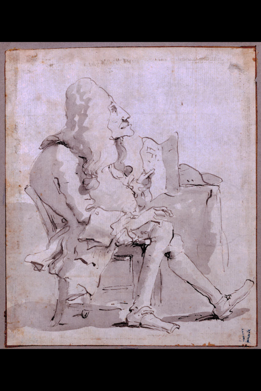 - NOTIZIE STORICO CRITICHE Il foglio proviene dalla raccolta di Giovanni Morelli e fa parte di un prezioso gruppo di caricature eseguite da Giambattista Tiepolo conservate presso il Gabinetto dei Disegni del Castello Sforzesco. Il ductus della penna assai sciolto e le ombre stese a pennello contribuiscono a conferire alla figura un fresco e momentaneo carattere umoristico. Nella produzione grafica di Giambattista Tiepolo si conoscono oltre duecento altri disegni analoghi di caricature, conservati in diversi musei e collezioni private. L'omogeneità del formato dei fogli del Castello Sforzesco, molti dei quali con gli angoli tagliati, oltre a similitudini tecniche, hanno fatto ipotizzare per essi una datazione ravvicinata fra il 1755 e il 1760. Morassi (1959) riteneva che essi andassero collocati cronologicamente al tempo della decorazione della villa Valmarana a Vicenza nel 1757, rilevando come la vena umoristica fosse ben presto apparsa nella produzione di Giambattista e come il figlio Domenico, ereditandola, l'avrebbe potenziata. In Tiepolo le caricature hanno soluzioni di volta in volta libere e non trovano riscontri puntuali nei personaggi illustri del suo tempo, ma sono piuttosto volte a esasperare, caricandoli, atteggiamenti e aspetti esteriori dei diversi ceti della società veneziana: alcune attitudini (figure di spalle, in piedi di profilo, sedute, ecc...) si possono individuare in una serie così ricca, senza mai una ripetizione, a testimonianza di una vena inventiva inesauribile.