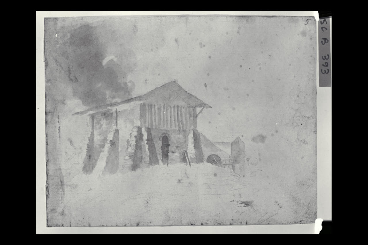 - NOTIZIE STORICO CRITICHE Attribuito al paesaggista veneto andrea Torresani, questo foglio illustra un casolare di campagna costruito sui ruderi di un'antica costruzione, di cui si riconoscono ancora i contrafforti angolari. Il disegno è entrato nelle collezioni comunali grazie al legato testamentario di Antonio Guasconi nel 1863.