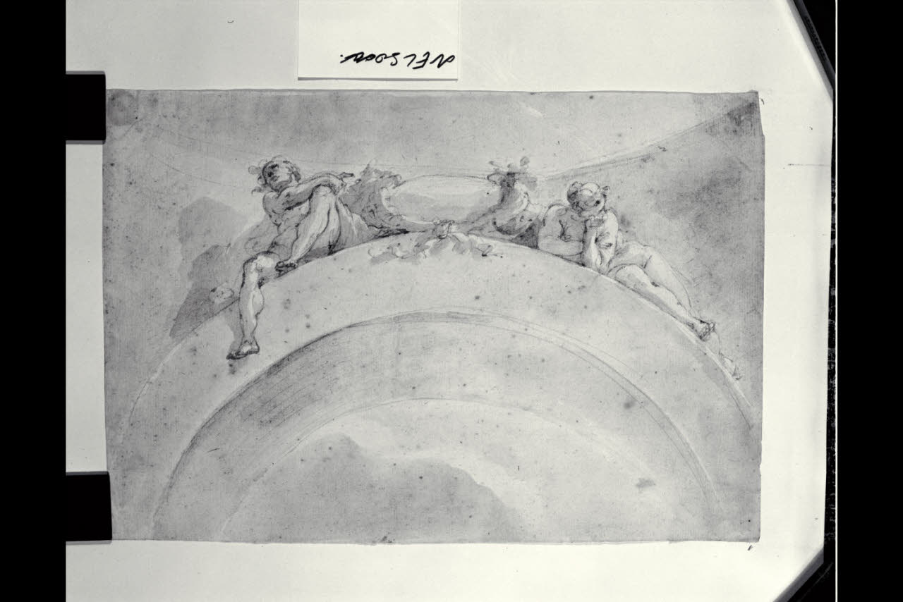 Due figure nude, una femminile distesa e una maschile seduta, sopra un arco con cornucopie (Particolari decorativi per interni di sale)