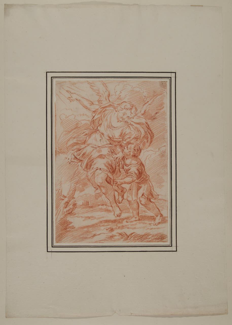 - NOTIZIE STORICO CRITICHE Il disegno, ascritto ad anonimo del XVII secolo nell'inventario storico del museo, è una copia dell'Angelo custode dipinto da Carlo Maratti. Fu molto probabilmente l'artista in persona a commissionare a Pietro Aquila la traduzione in incisione di questo suo lavoro, dedicandolo all'amico Pietro Bellori (cfr. Luisa Erba in P. Bellini (a cura di), L'opera incisa di Carlo Maratti, 1977, p. 93). Il disegno del Castello Sforzesco è delineato a matita rossa nello stesso verso dell'acquaforte e contribuisce a testimoniare della fama di cui godettero le invenzioni del Maratti presso i suoi contemporanei.