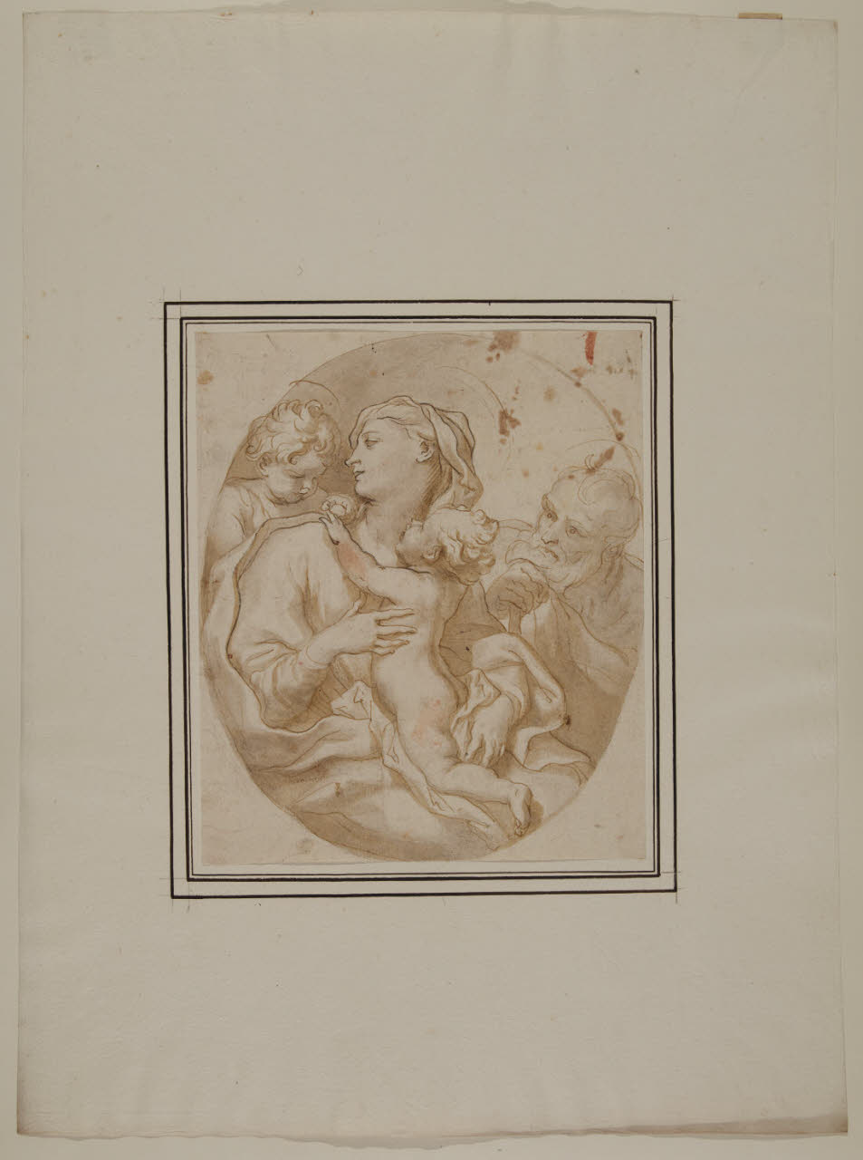 - NOTIZIE STORICO CRITICHE Già appartenuto alla collezione del Principe Alberico XII Barbiano di Belgioioso, questo disegno entrò nelle collezioni civiche nel 1943 per dono della famiglia Trivulzio. Il foglio illustra una Sacra Famiglia con San Giovannino entro una cornice ovale, e per il ductus sinuoso della penna combinato all'impiego della matita in sottotraccia e all'acquarellature in bistro, è stato avanzato il nome dell'artista genovese Domenico Piola (parere orale Marco Riccomini, 2009).