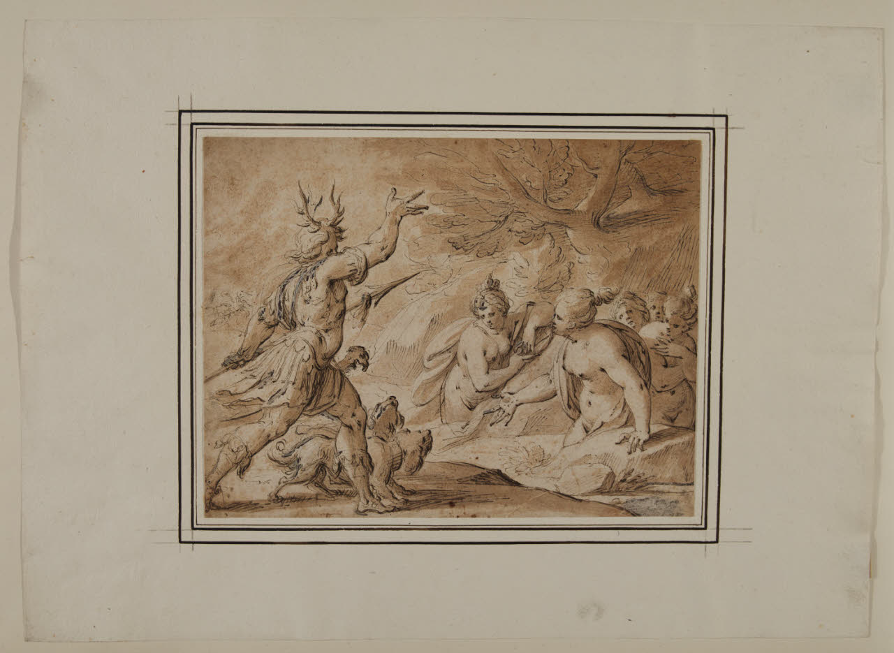 - NOTIZIE STORICO CRITICHE Già appartenuto alla famiglia Trivulzio, questo disegno fu catalogato come anonimo del XVII secolo al suo ingresso nel 1943 nelle collezioni civiche. Il foglio illustra Diana che, sorpresa da Atteone, mentre si bagna in un corso d'acqua con alcune compagne, lo tramuta in cervo, così come narrato nelle Metamorfosi di Ovidio. Sylvie Béguin nel 1991 (parere orale) propose di attribuire l'opera alla cerchia del fiammingo Hans Speckaert, i cui disegni sono stati copiati frequentemente, mentre i suoi originali sono oggi rari. In effetti, lo stile del disegno in esame sembra affine a quello di Hans von Aachen (1552-1615), allievo di origine tedesca di Speckaert, il cui debito nei confronti di questo maestro fu notevolissimo. Il periodo speckaertiano di von Aachen è rappresentato secondo Fucíková (1992, p. 15) da un disegno illustrante Diana e Atteone oggi al Fogg Art Museum di Cambridge (inv. 1980.90) che parafrasa un foglio con il medesimo soggetto di Budapest della mano di Speckaert (inv. 1368). Rispetto a quest'ultimo, le figure di von Aachen sono più robuste e vitali, libere allo stesso tempo da pose artificiose e allungate. Il foglio del Castello Sforzesco sembra avere come prototipo quello di Budapest per la scelta di rappresentare Atteone già parzialmente tramutato in cervo, e può essere accostato stilisticamente a quello del Fogg Art Museum: non solo vi si potrà notare la medesima impaginazione della scena, ma anche la persistenza di alcuni dettagli, come i due cagnolini tra le gambe di Atteone, l'impugnatura della spada a testa di aquila e la posa della prima bagnante a sinistra che sembrano quasi autocitazioni. Un utile confronto è anche quello con il disegno del Louvre dello stesso von Aachen con Venere trattiene Adone che parte per la caccia (INV 21071 recto).