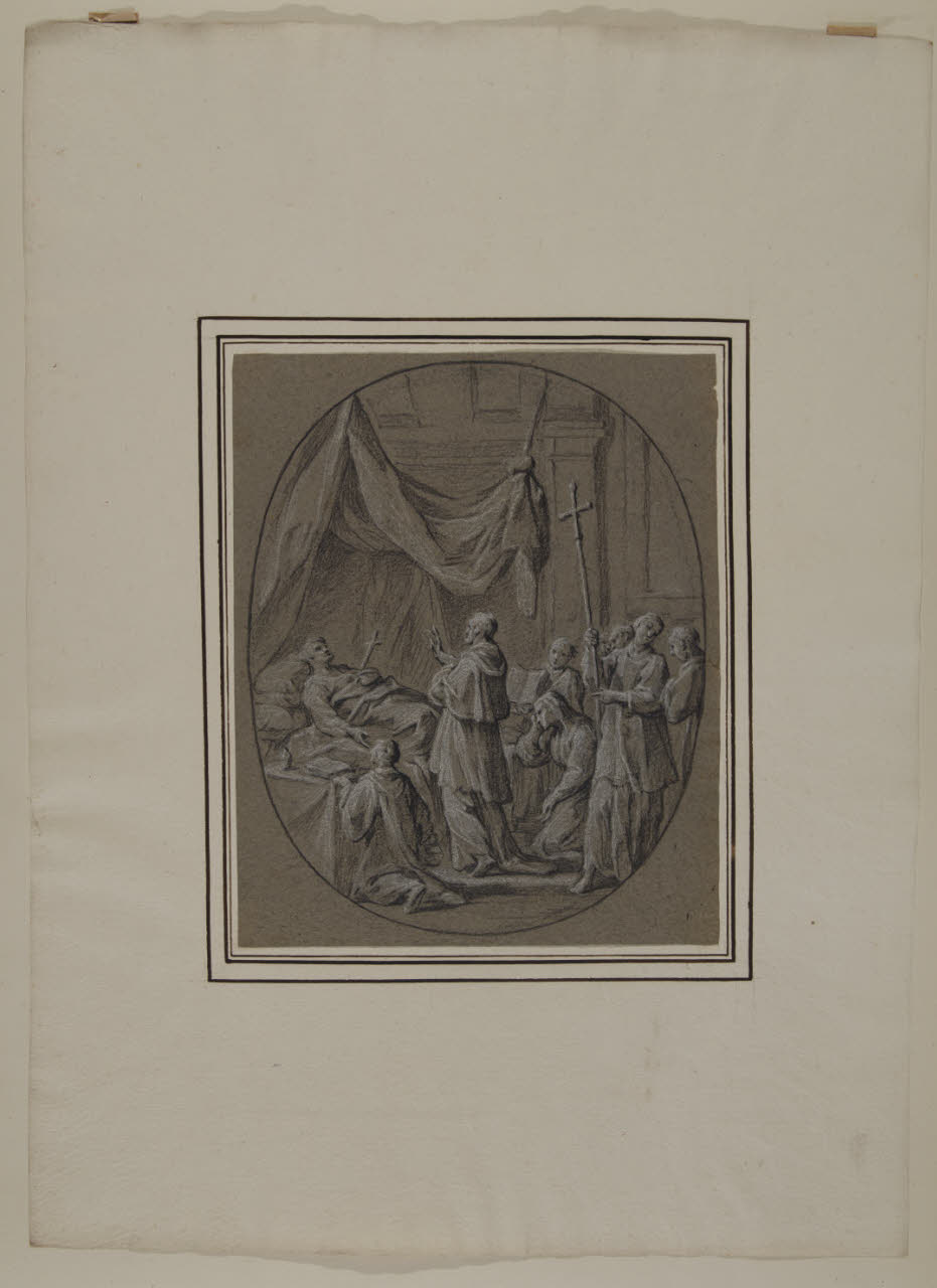 - NOTIZIE STORICO CRITICHE La serie è costituita da venti disegni con episodi della "Vita di sant'Ambrogio", stagliati come bassorilievi entro ovati. Come indicato dalla Garberi nel suo saggio (1993), si tratta di studi definitivi per i venti piccoli medaglioni a monocromo realizzati ad affresco nel soffitto della cripta della basilica di Sant'Ambrogio. Gli affreschi, dieci dei quali distrutti nei bombardamenti del 1943, sono opera di Giambattista Sassi, incorniciati da fregi in stucco di Giambattista Aliprandi; l'intero apparato decorativo è databile al 1730 circa. I disegni sono improntati a un linguaggio raffinato, morbido e sciolto, con guizzi luminosi dati dal gessetto bianco; la fresca immediatezza, l'elegante virtuosismo, la stesura rapida ed estrosa sono caratteristiche tipiche del linguaggio barocchetto riscontrabili nell'attività artistica del Sassi soprattutto negli anni prossimi al terzo decennio del XVIII secolo.\nIl foglio mostra la morte di Ambrogio, avvenuta a Milano il 4 aprile 397.\nNell'inventario del 1814 dei beni di Alberico XII Barbiano di Belgioioso (trascritto in M. Forni, "Abitare da principe. Le residenze e le collezioni di Alberico XII Barbiano di Belgiojoso", 2020), nella Cartella I "che contiene altri disegni" sono registrati "20 altri rappresentanti la vita di S. Ambrogio", stimati £ 15: plausibile che si riferisca proprio alla serie in analisi.